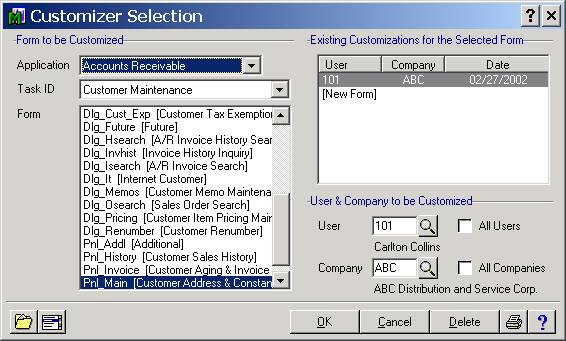 Presented below is the Customizer module found in MAS 90. This screen allows the user to pull up virtually any data input screen in MAS 90 for customization purposes. In this screen we see that the user is in the process of selecting the Customer name and Address screen from the Accounts Receivable Customer Maintenance menu option. Notice that this customization will apply to one user only (Carlton Collins in this example); but it could apply to all users by simply checking the “All Users” check box. Another strong feature is how MAS 90 allows the user to apply these customizations to one particular company, or to all companies assuming that multiple companies are present. This is very powerful.